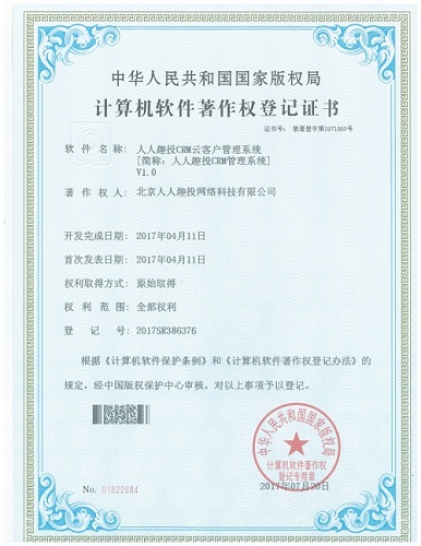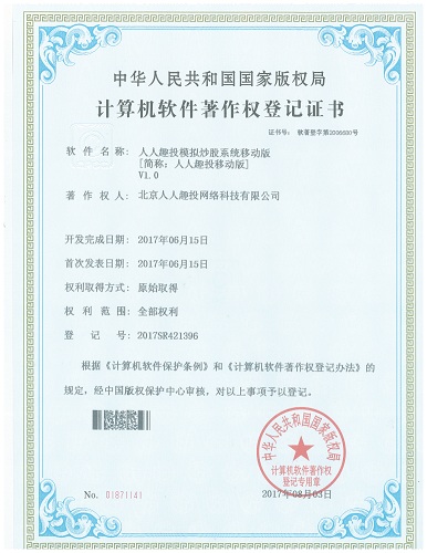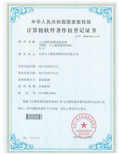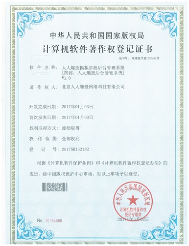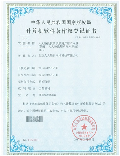 公司研发的人人趣投模拟炒股用户账户系统、人人趣投模拟炒股系统移动版、人人趣投模拟炒股后台管理系统、人人趣投股移动版系统、人人趣投CRM云客户管理系统等5个核心软件获得由中国版权保护中心颁发的计算机软件著作权证书,该系列著作权是我公司独立开发完成原始取得,拥有完全自主知识产权。